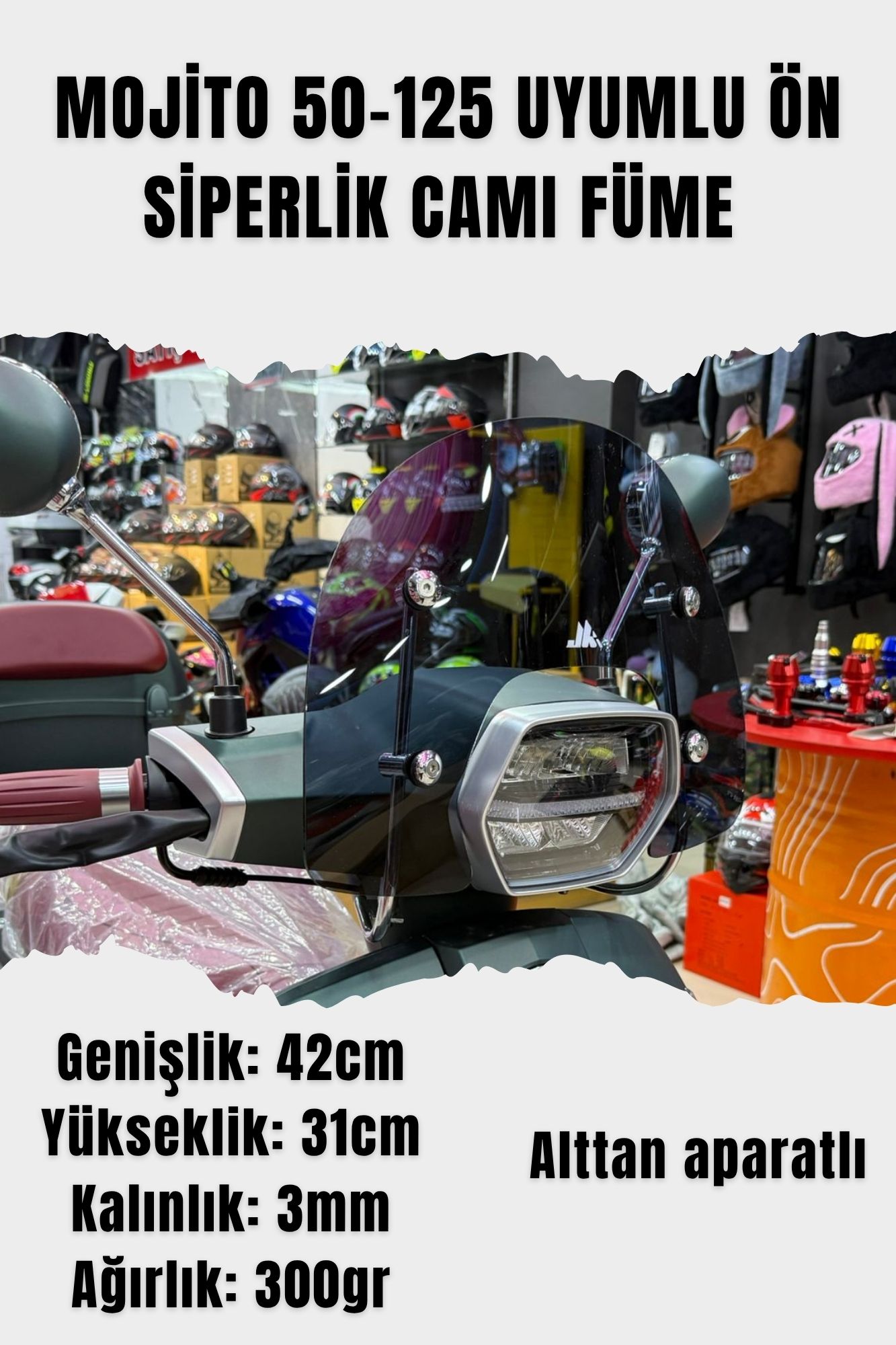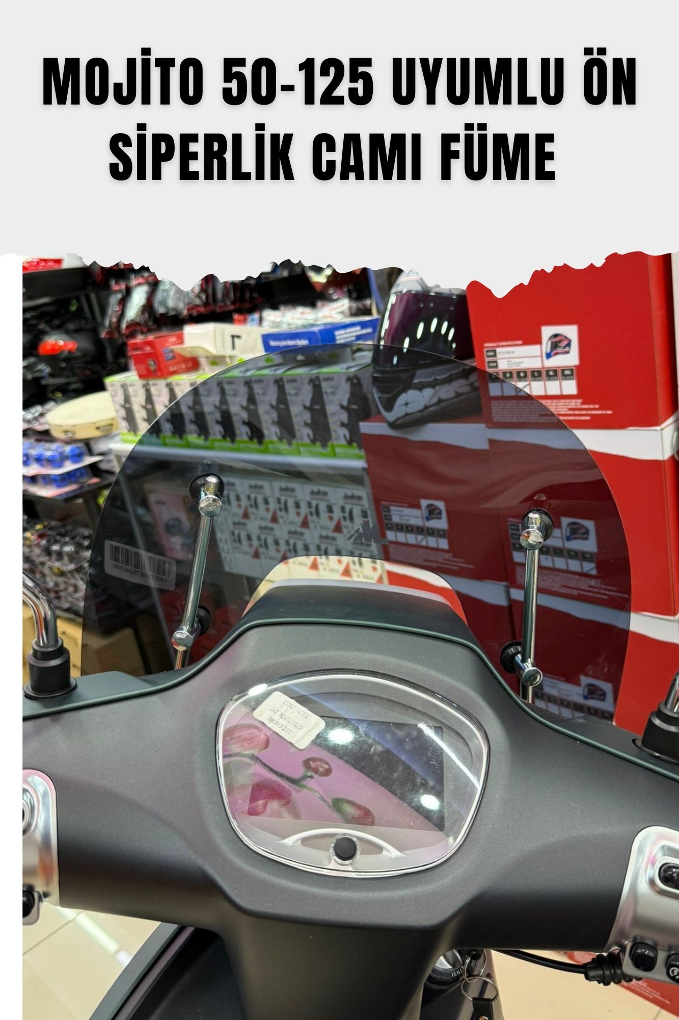Scooter sürüşlerinde hem rüzgâr hem de dış etkenlerden korunmak isteyenler için ideal! JİEKAİ markasının Mojito 50-125 modelleriyle uyumlu füme ön siperlik camı, şık tasarımıyla motosikletinizin görünümünü tamamlar, konforlu bir sürüş deneyimi sunar.
