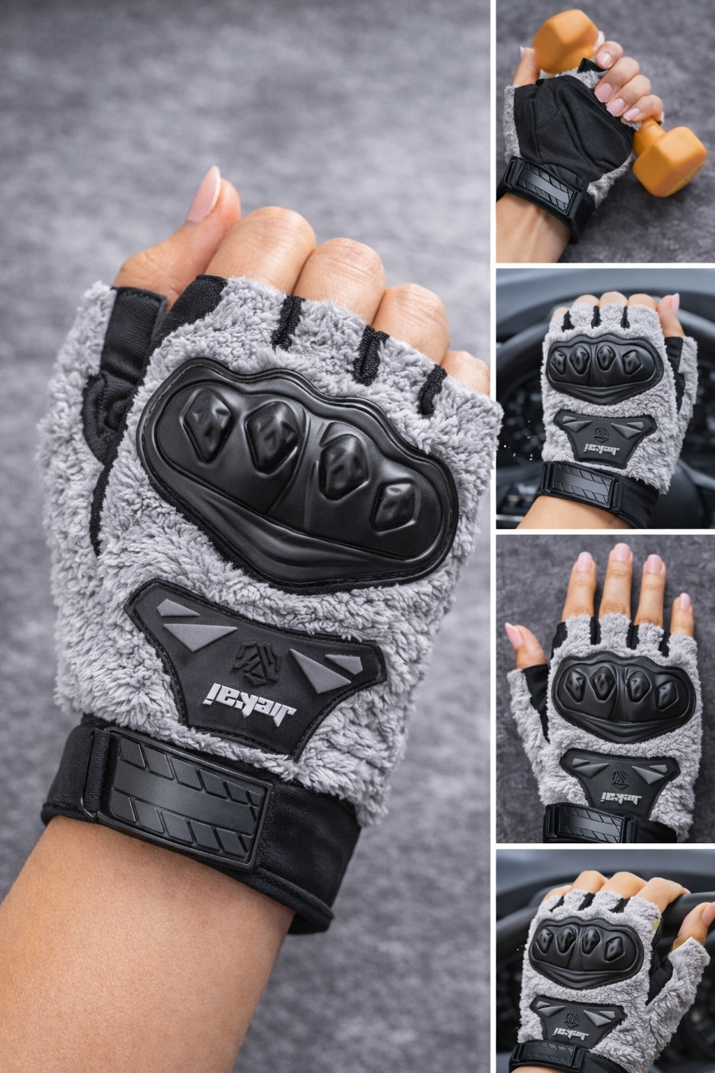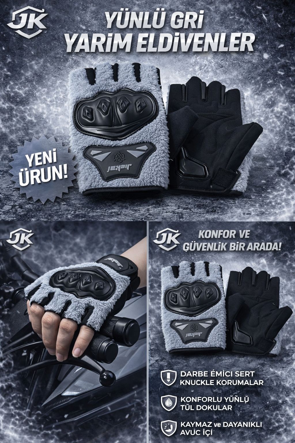 JK Peluşlu Yarım Eldiven – Gri, konforu, sıcaklığı ve şıklığı bir arada arayan kullanıcılar için stoklarımıza girmeye hazırlanan özel bir üründür. Hem günlük kullanım hem de motosiklet sürüşlerinde fark yaratmak isteyenler için ideal bir seçimdir.