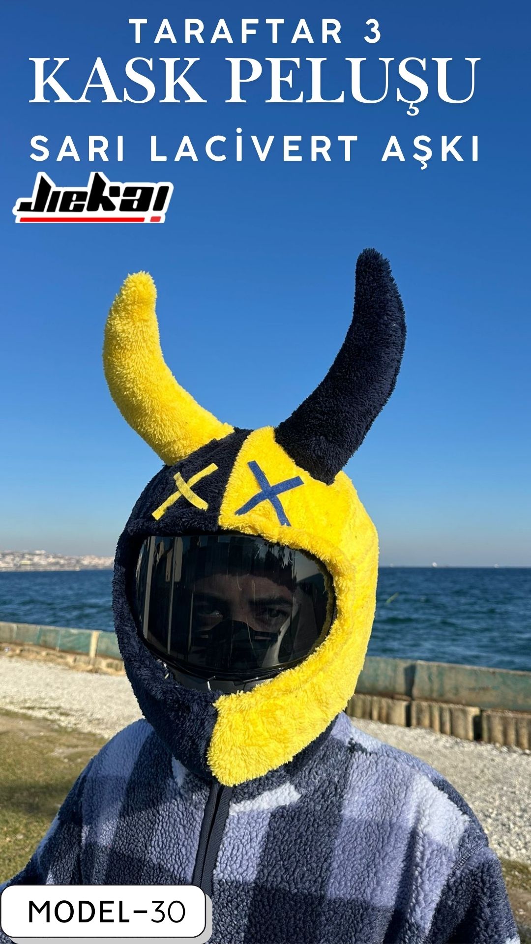 Taraftar-3 Sarı Lacivert Kask Peluşu, JİEKAİ kalitesiyle üretilmiş olup taraftar ruhunu sürüşlerine yansıtmak isteyenler için vazgeçilmez bir üründür.