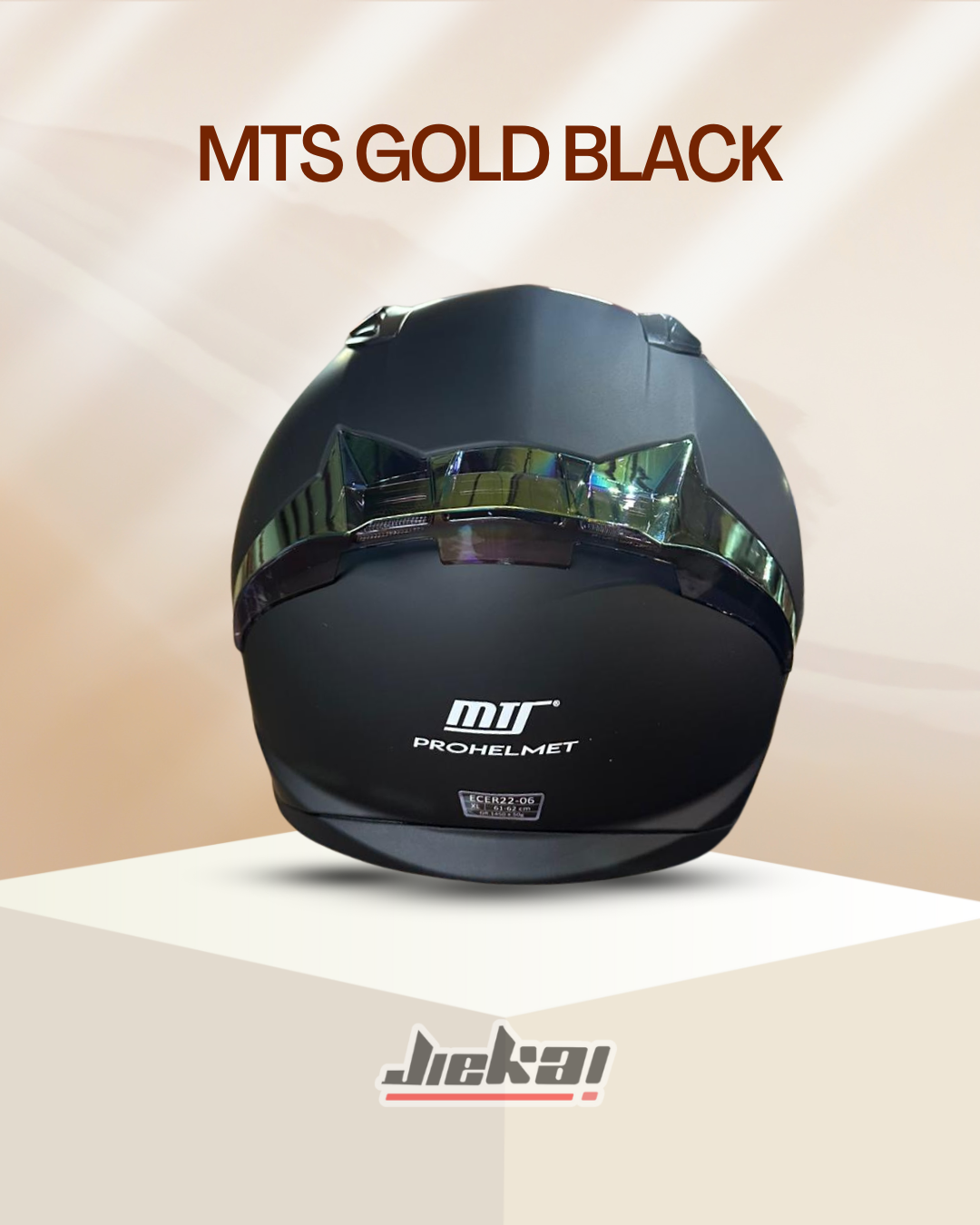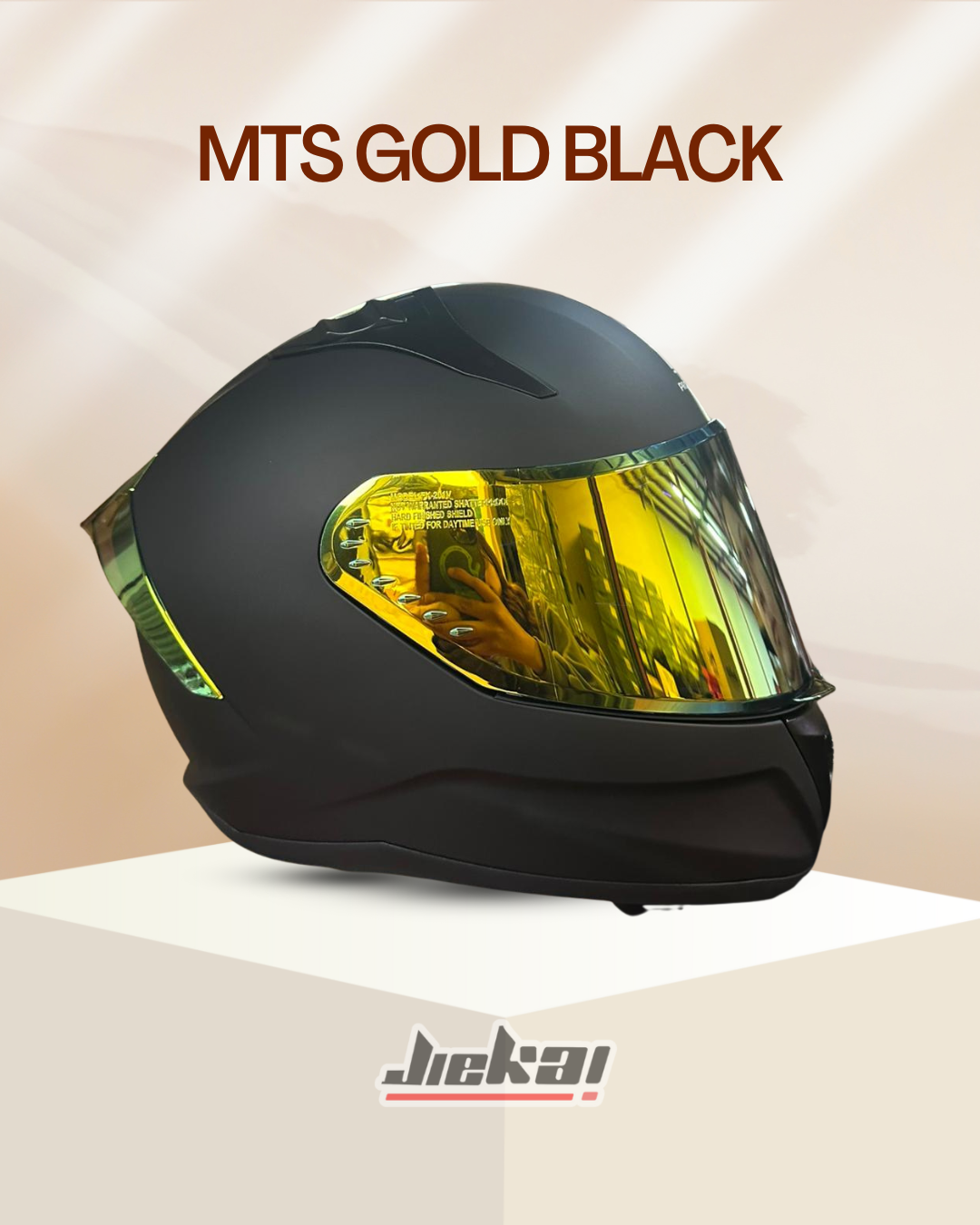MTS’in özel tasarımı Gold Black kask, mat siyah gövdesi ve altın yansımalı vizörüyle tarzı ve korumayı bir araya getiriyor.